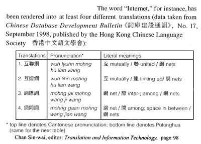 A closely related problem is every bit as alive in Chinese as in Spanish, as two papers from the middle section of Chan Sin-wai's volume clearly reveal. (Note 2) The main difference is that the basic structure of the Chinese language may be better endowedperhaps too well endowedto handle the thousands of invading new words and acronyms. The result can be a veritable profusion of possible Chinese translations for a specific Internet term. For instance, the word Internet itself can be conveyed in at least four different ways in Chinese, as transliterated in the following table in both Cantonese and Mandarin: