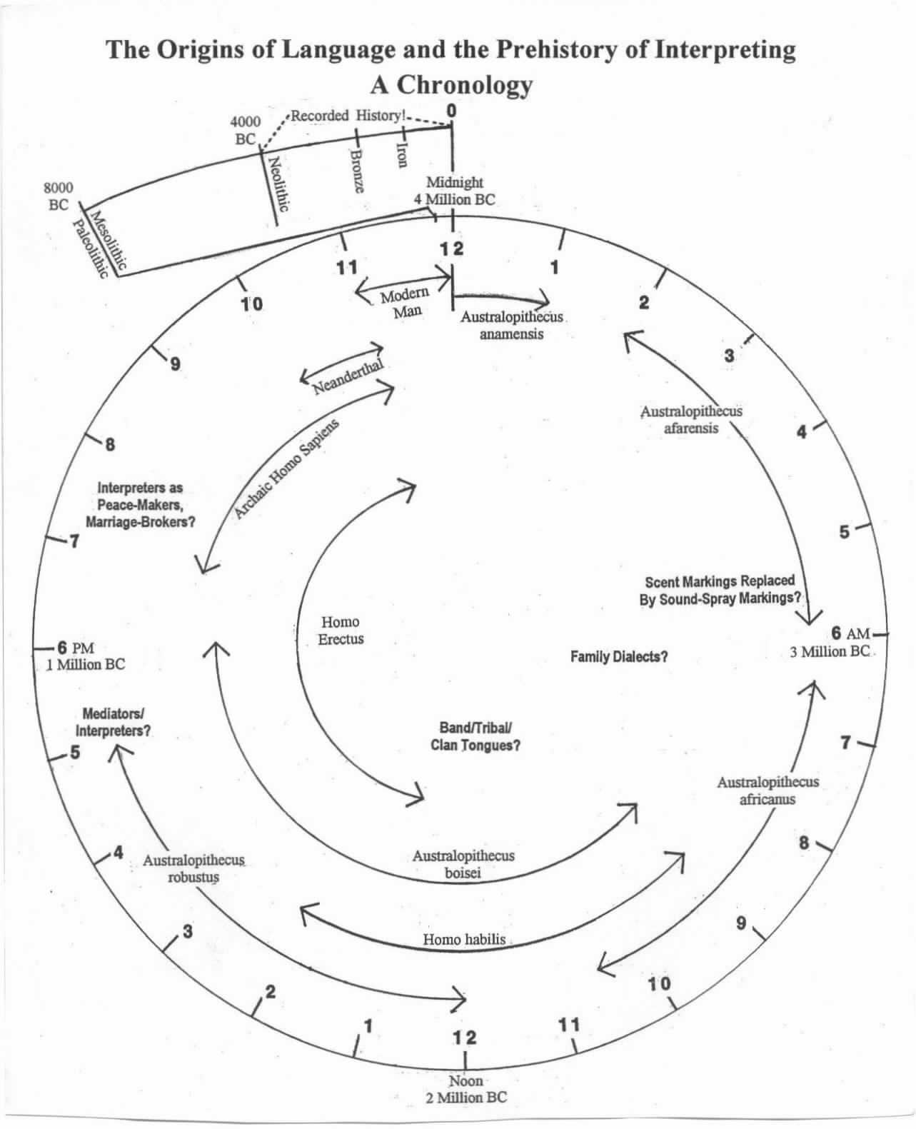 Let me pass out these sheets at this time. Each of these sheets shows a time-clock, which I'm calling, like the subtitle for this paper "The Origins of Language and the Prehistory of InterpretingA Chronology." You may have seen something like this time-clock before, probably relating to geology and the age of the earth, but never in connection with the prehistory of language. The somewhat similar-looking chart you'll see in geology books shows the age of the earth. Or the one for biology that starts with the origin of life. In either case the time periods are far longer than the ones I'm showing you here today. The one for geology is based on the famous 4.5 billion year age of the earth, with all of recorded human history entering in only at one second before midnight.