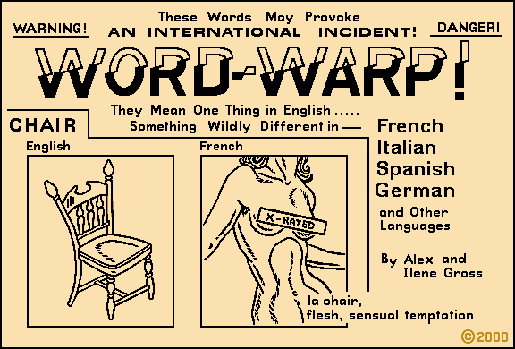 It is this bump, this sense of dislocation that distinguishes a "Word-Warp" from other better-known figures of speech, plus the fact that it involves not one but twoor morelanguages. Word-Warps are essentially visual puns, standing arrogantly astride the borders between a pair of languages and cultures, with one leg planted firmly in each. Spelled precisely the same in both languages but with remarkably different meanings, they have the potential for stirring up international misunderstandings and are capable at the very least of throwing would-be language students for a loop.